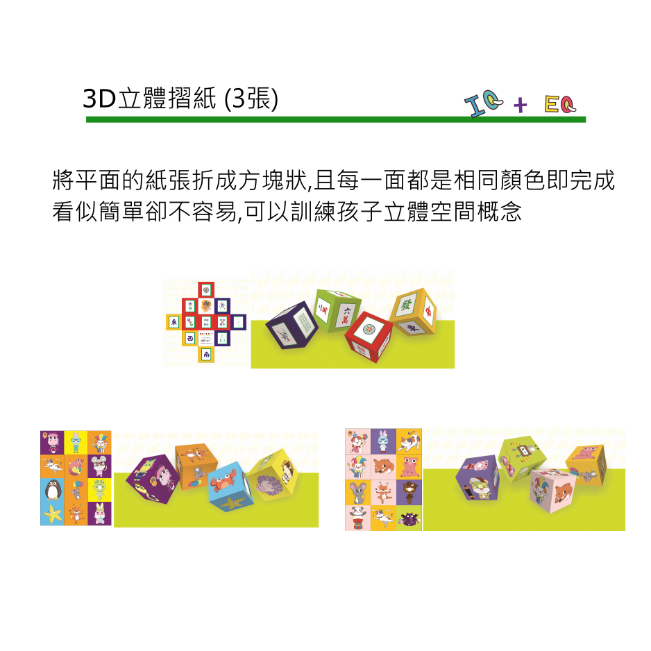 -3張3D立體摺紙:將平面紙張折成方塊狀,且每一面都是相同顏色即完成,看似簡單卻不容易。