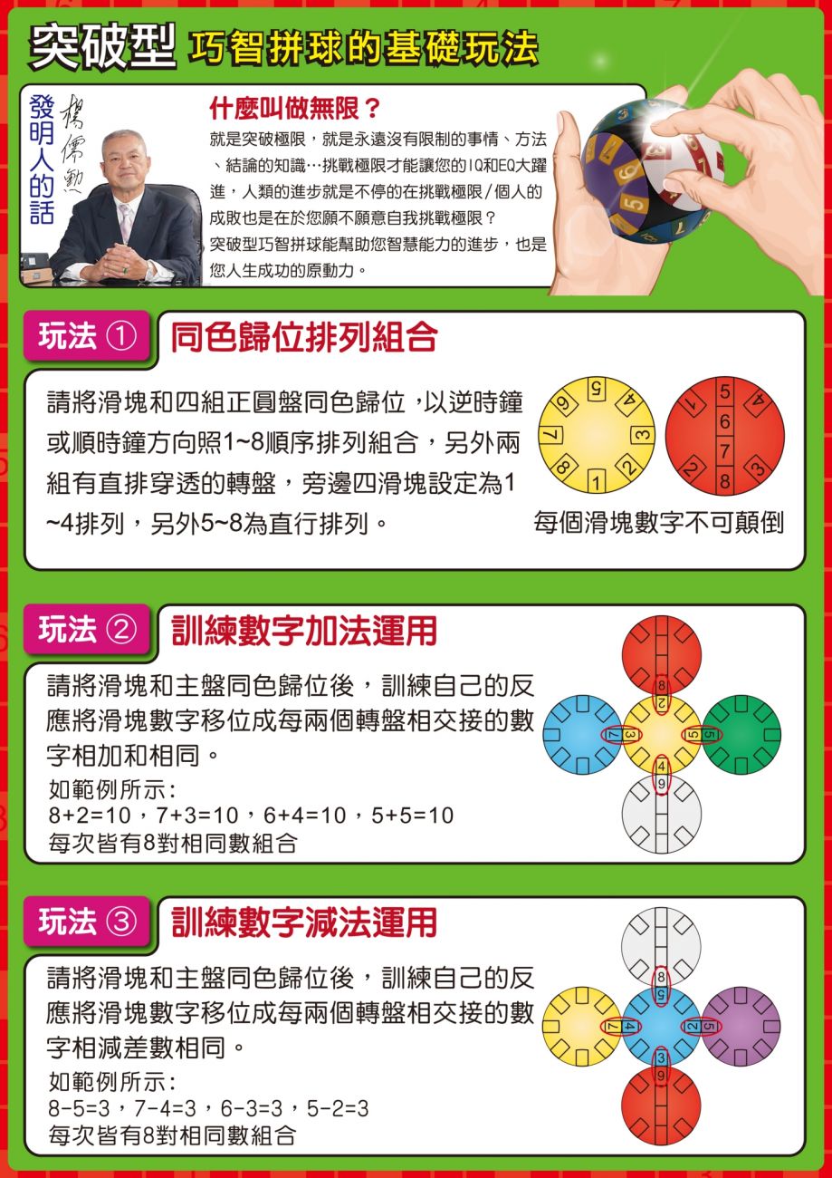 巧智拼球是由中國古老文化易經數學研發出來,超自然數益智玩具其變化率有48的96次方,是目前所知世界最有智慧的數學遊戲。