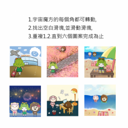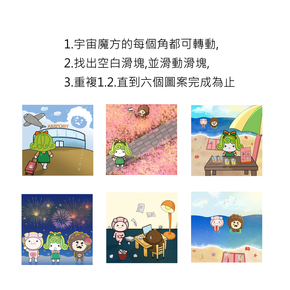 經由旋轉每個角、轉盤、滑塊拼湊出完整的六面圖案